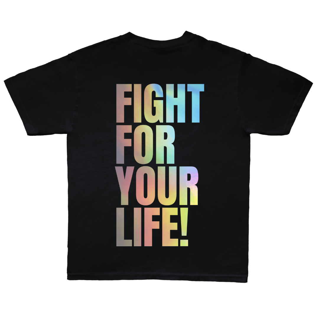 Bold and unbreakable. The black Fight for Your Life hologram tee brings intensity and style with a reflective edge that hits different under the light. Built for the fighter who never backs down.